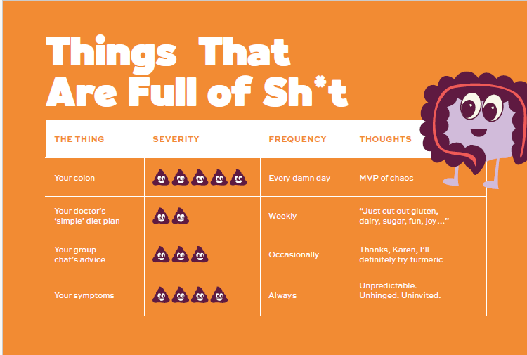 Includes a flare-up bingo card and a very unscientific “Things That Are Full of Sh*t” meter, because sometimes laughing is the only thing that works.