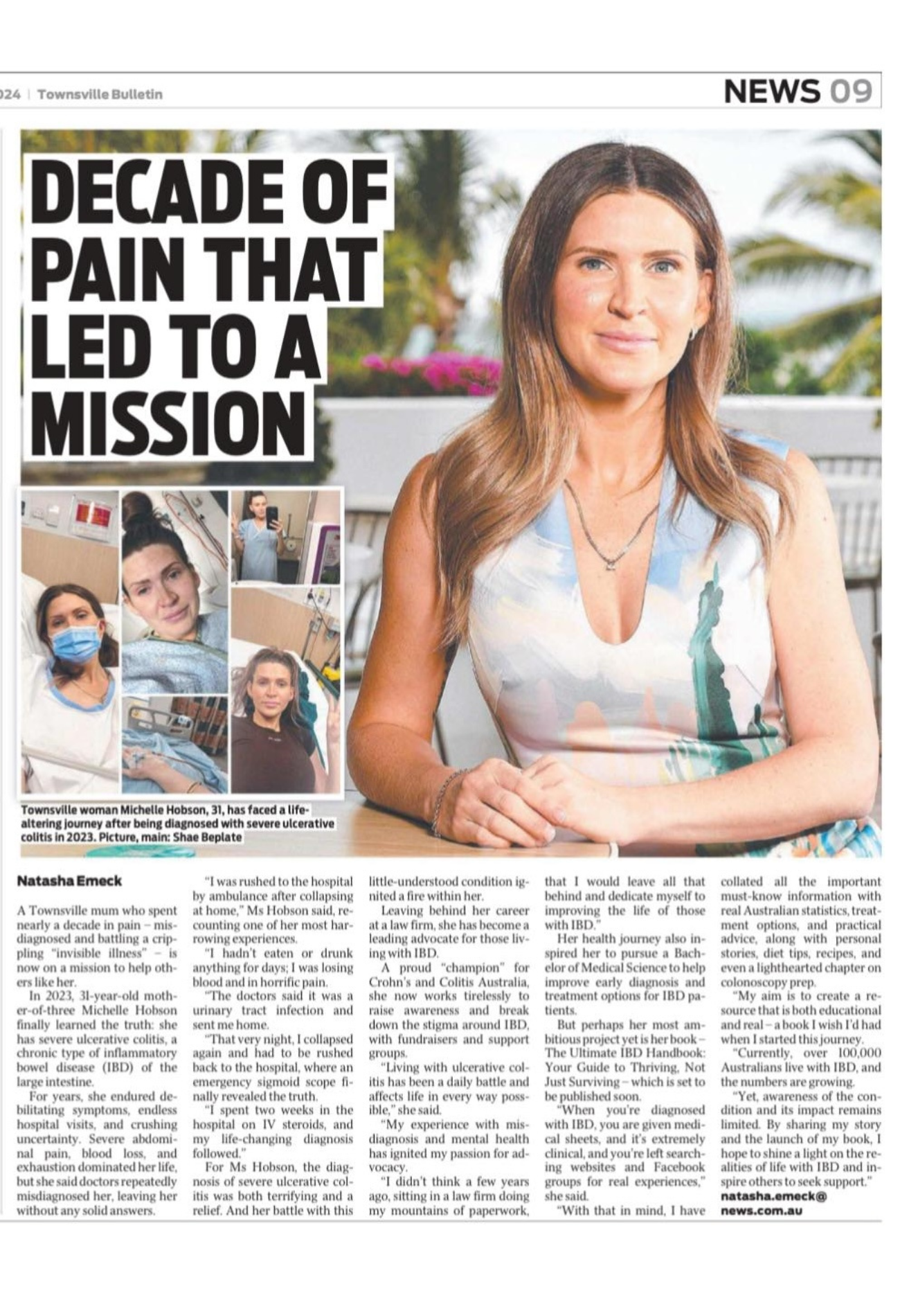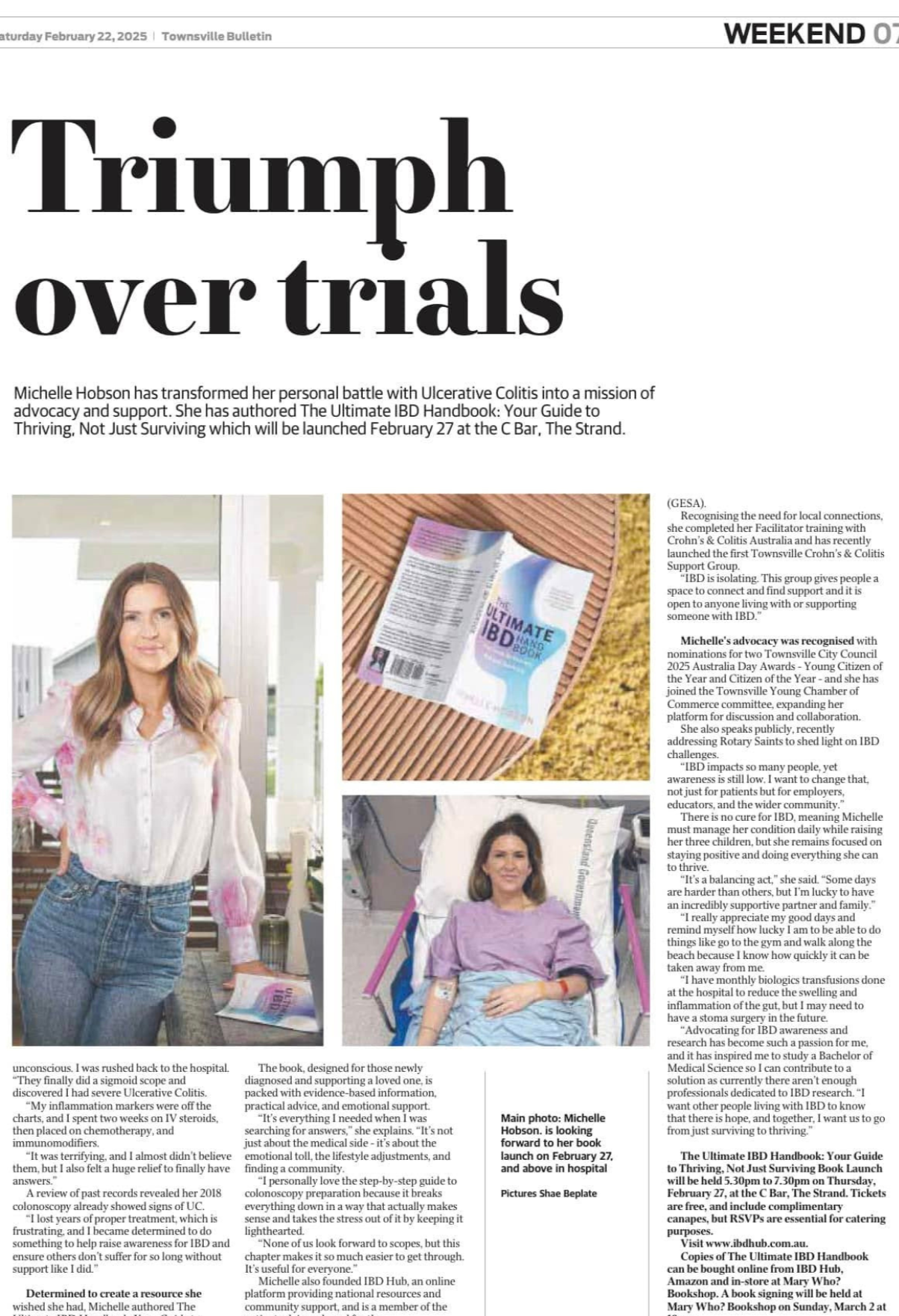 A special feature in the NQ Weekend, Townsville Bulletin, I discussed how my health journey led me into advocating for IBD awareness and supporting lifestyle and emotional challenges.
